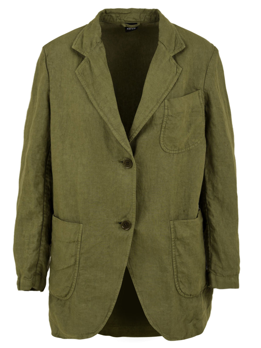 Giacca Blazer da donna monopetto in viscosa firmata Aspesi. Questa giacca blazer monopetto da donna è una scelta di tendenza grazie alla sua composizione unica di viscosa di cotone e seta. Presenta un'allacciatura a due bottoni madreperla, due tasche sul davanti e un taschino al petto. Ideale per un look professionale, elegante e raffinato.