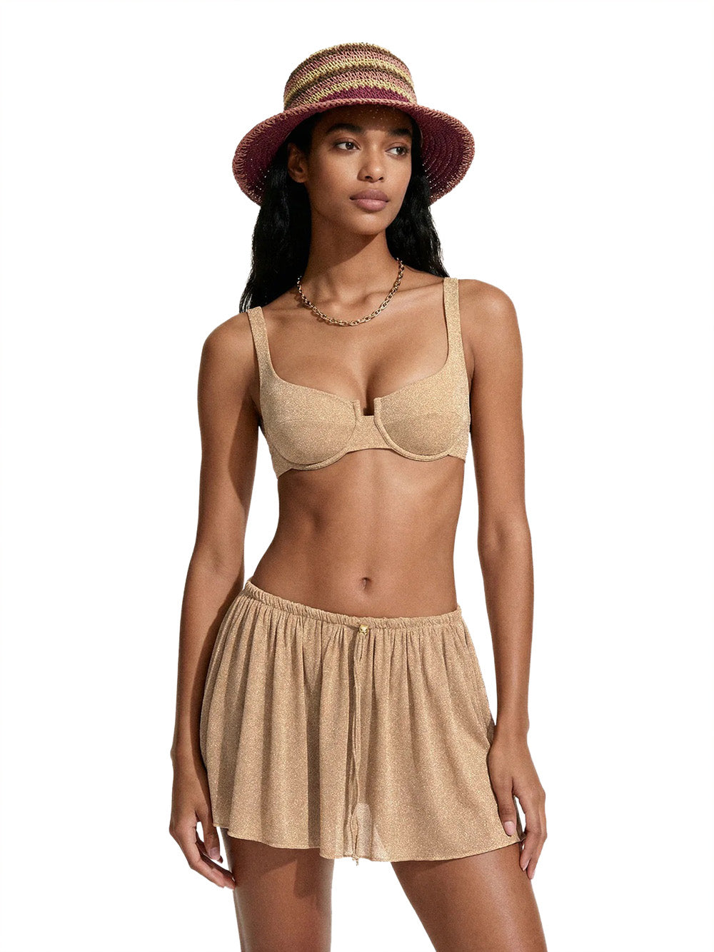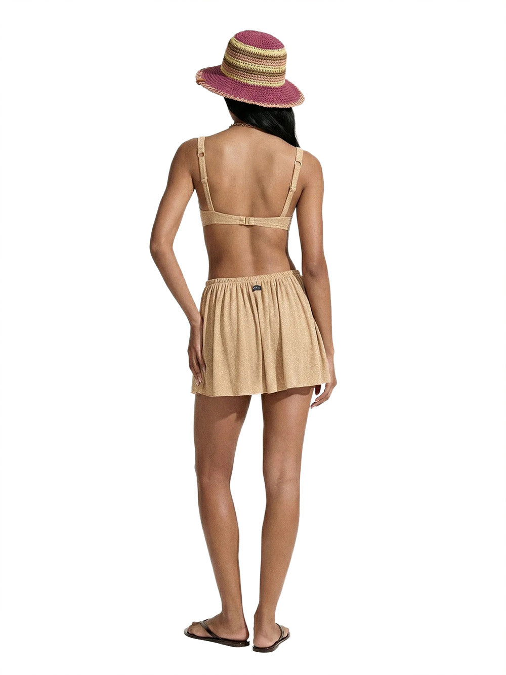Gonna corta ME FUI Donna - Oro realizzata in tessuto di viscosa con lurex. Il capo è dotato di coulisse regolabile in vita e presenta una silhouette aderente per valorizzare la figura femminile. Il modelloAI indossa una taglia S ed è alto 175 cm, garantendo una perfetta vestibilità.