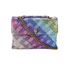 La borsa Large Kensington Soft di Kurt Geiger è un'elegante accessorio per la donna che cerca stile e praticità. Realizzata in denim a righe arcobaleno con dettagli in foil dorato, presenta una testa d'aquila in ottone anticato con cristalli sulla patta frontale.