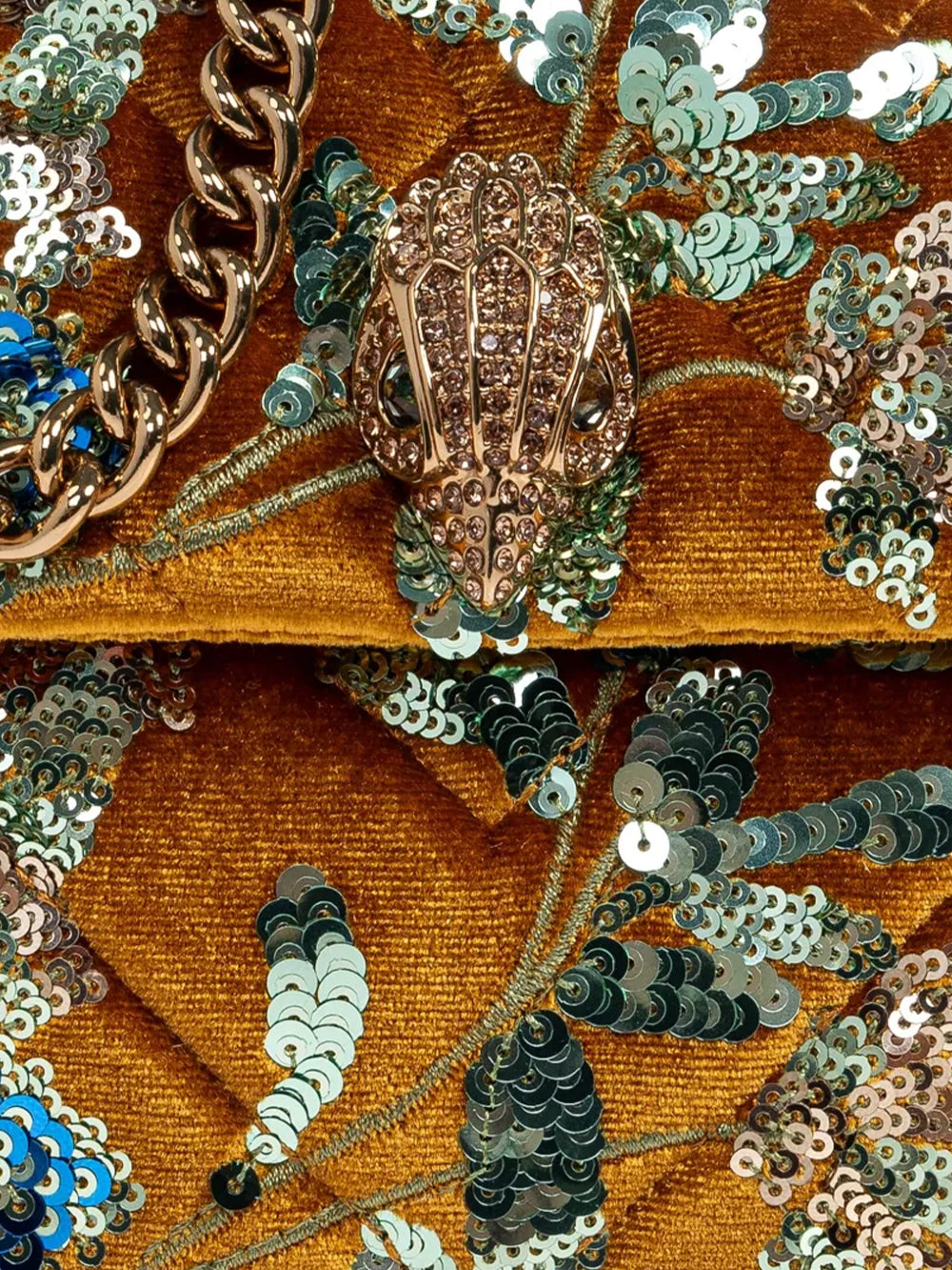 La Borsa Velvet Mini Kensington di Kurt Geiger è l'accessorio perfetto per aggiungere una nota di eleganza al tuo look. Questo pezzo unico, decorato con pailletes e impreziosito da un logo in ottone con strass, è disponibile in una vivace tonalità gialla che non passerà inosservata.