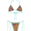 Realizzato in viscosa e lurex fantasia, questo bikini è composto da una parte superiore a triangolo con imbottitura interna estraibile e da uno slip con laccetti regolabili.