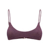 Costume top fisso ME FUI Donna - Bordeaux realizzato in tessuto di viscosa con lurex, presenta una struttura aderente che valorizza la silhouette. Il capo è dotato di imbottitura interna estraibile e chiusura con gancio. Il modello virtuale AI simula un'altezza di 175 cm, indossando la taglia S.