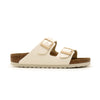 Sandalo Arizona Birko Flor Birkenstock Unisex - Bianco presenta una struttura versatile composta da due cinturini regolabili con fibbie in metallo. La tomaia è realizzata in Birko-Flor, un materiale sintetico resistente e delicato sulla pelle. La silhouette è semplice e pulita, caratterizzata da un profilo basso. Il plantare, dalla forma anatomica, è costituito da un mix di sughero e lattice, mentre il sottopiede è rivestito in pelle scamosciata. La suola è realizzata in EVA, leggera e ammortizzante.