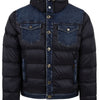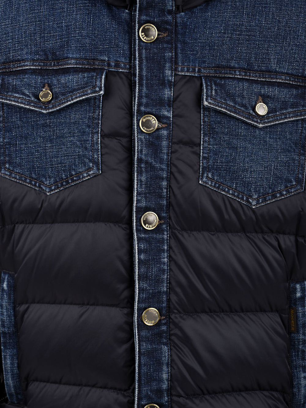 Giubbotto Turato-104S MooRER Uomo - Blue. Questo giubbotto combina jeans giapponese e sezioni trapuntate in piuma d'oca per una robusta costruzione. Il denim è prodotto con telai tradizionali, garantendo irripetibili imperfezioni che aggiungono carattere. Trattato con lavaggio soft per evidenziare le cuciture, l'indumento presenta una chiusura con bottoni chiodo. Il cappuccio fisso offre regolazione, mentre alamari regolano la vita, completando una silhouette versatile.