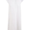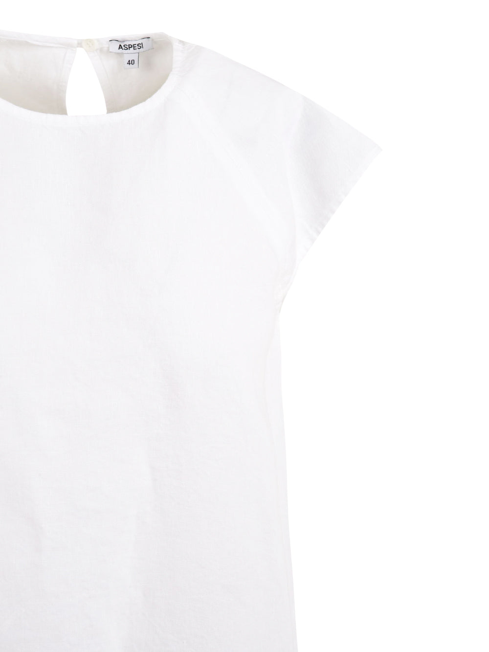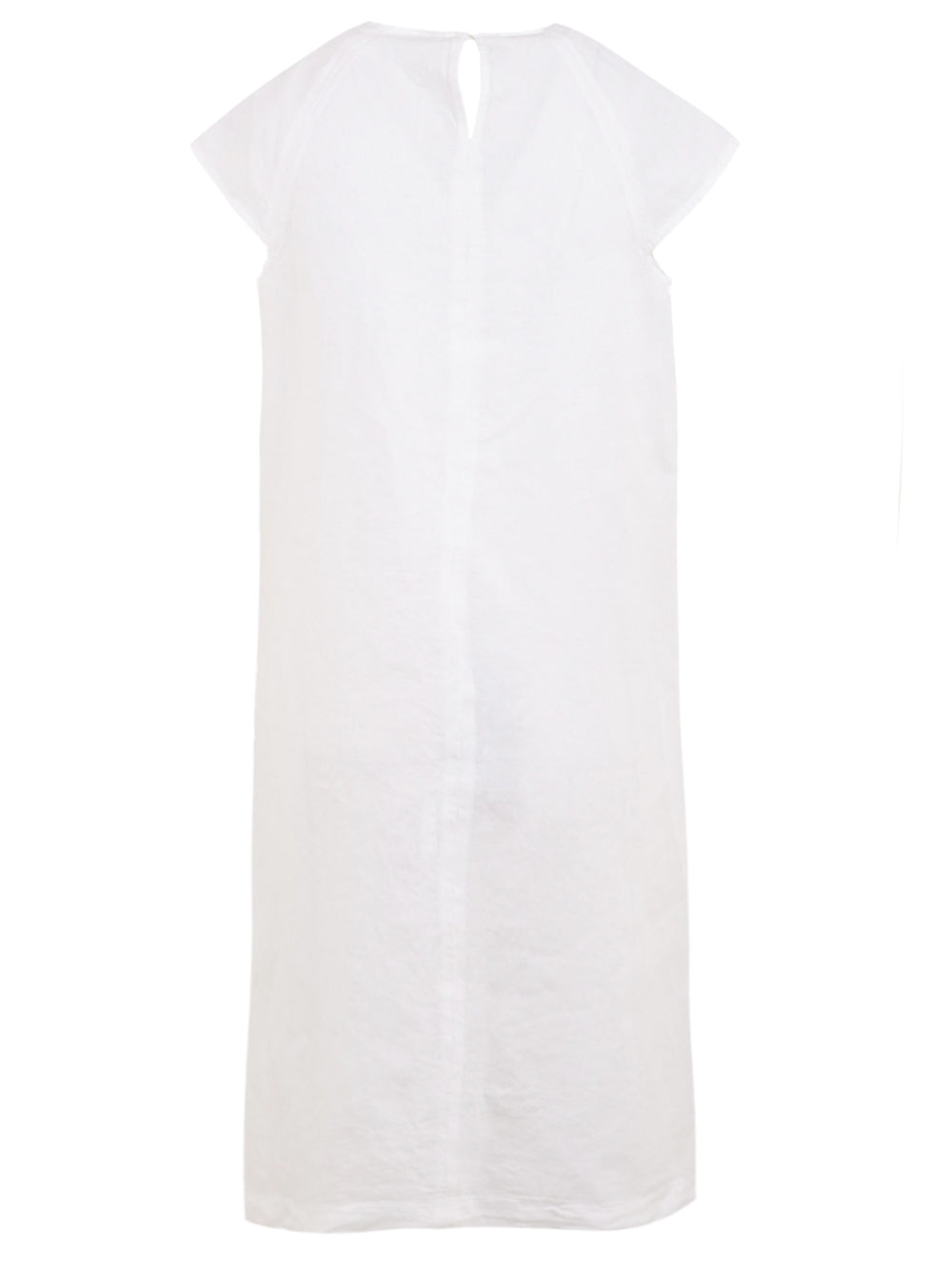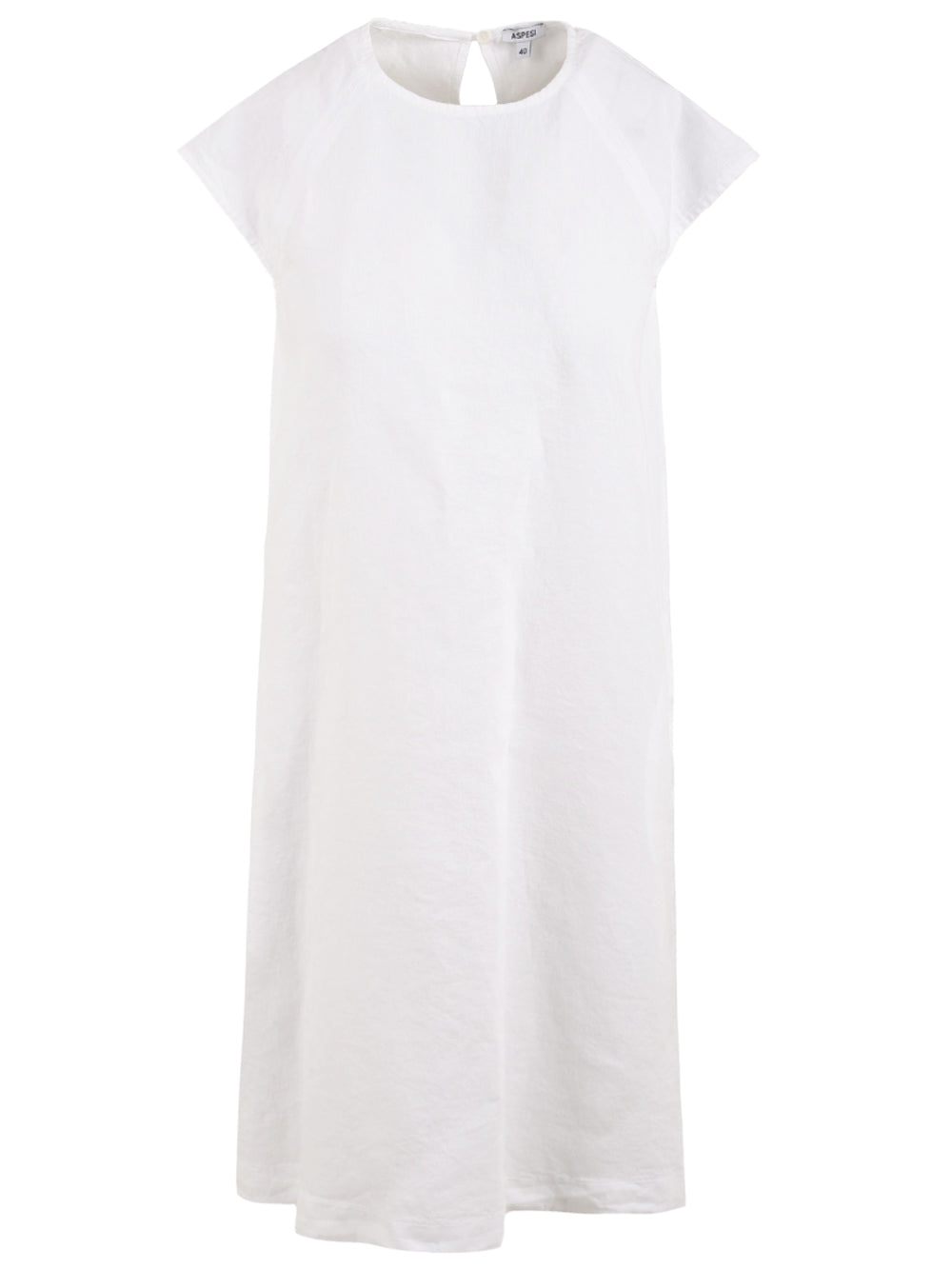 Abito Aspesi Donna - Bianco. Questo abito in stile camicia è realizzato interamente in lino, materiale noto per la sua leggerezza e traspirabilità. La silhouette presenta una struttura rilassata con maniche corte, ideale per un comfort ottimale. La linea essenziale del design valorizza la naturalezza del tessuto, conferendo un aspetto pulito e lineare.