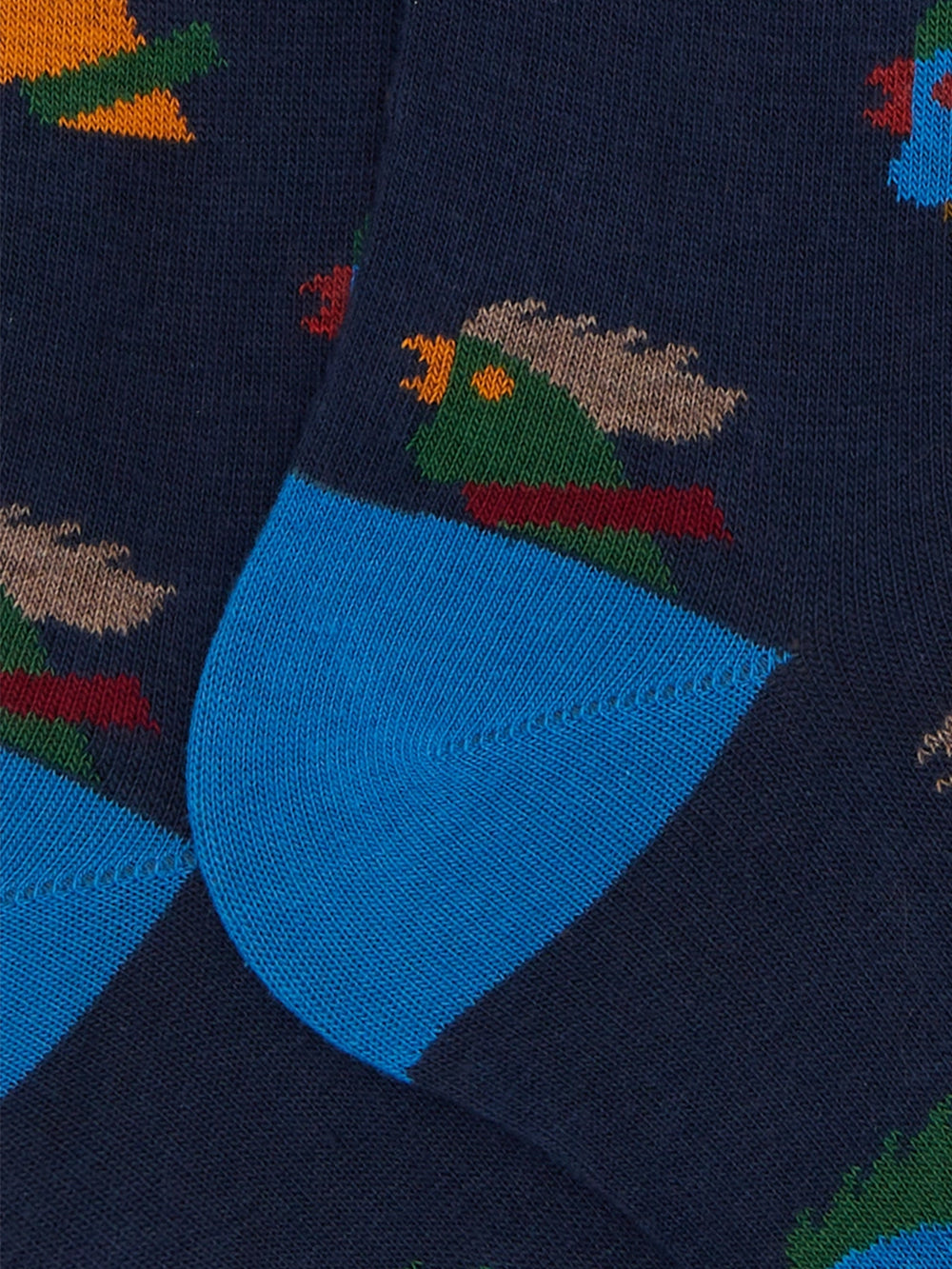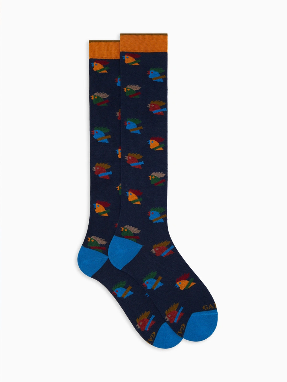Le calze lunghe Gallo con fantasia galli multicolore sono l'accessorio ideale per chi desidera aggiungere un tocco di originalità al proprio guardaroba. Realizzate in cotone blu leggero ed elasticizzato, queste calze offrono comfort e distinzione, firmando ogni passo con autenticità e stile inconfondibile.