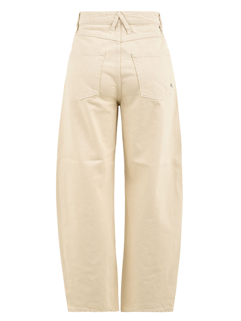 Pantaloni wide leg da donna con vita bassa molto stretta. Caratterizzato da una gamba piuttosto ampia e curva con lunghezza cropped e cavallo sceso, il modello a quattro tasche è realizzato in un confortevole bull denim rigido di puro cotone organico certificato GRS (Global Recycled Standard) ed è declinato in un'elegante tonalità oyster con tintura diretta. Completano il capo i richiami al logo di Cycle, espressi dall'incrocio di passanti sul retro e dal dettaglio placcato sulla tasca posteriore destra.
