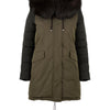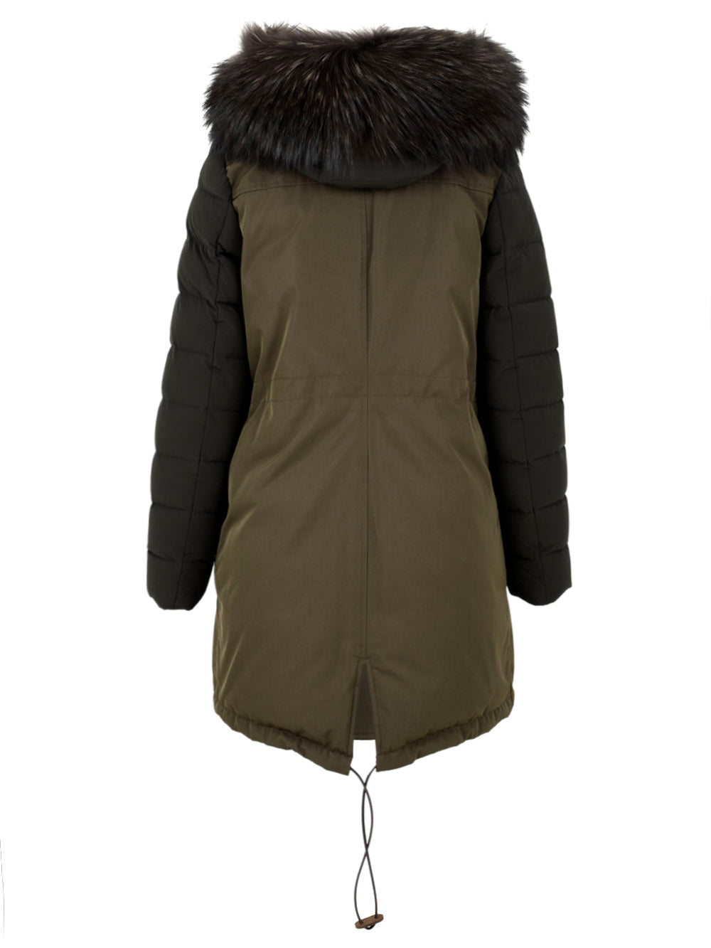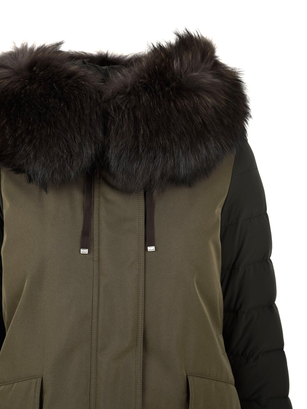 Women's parka by Moorer made of technical fabric, featuring contrasting quilted sleeves and a hood with a voluminous fur trim. A warm and versatile garment, ideal for the upcoming season!
