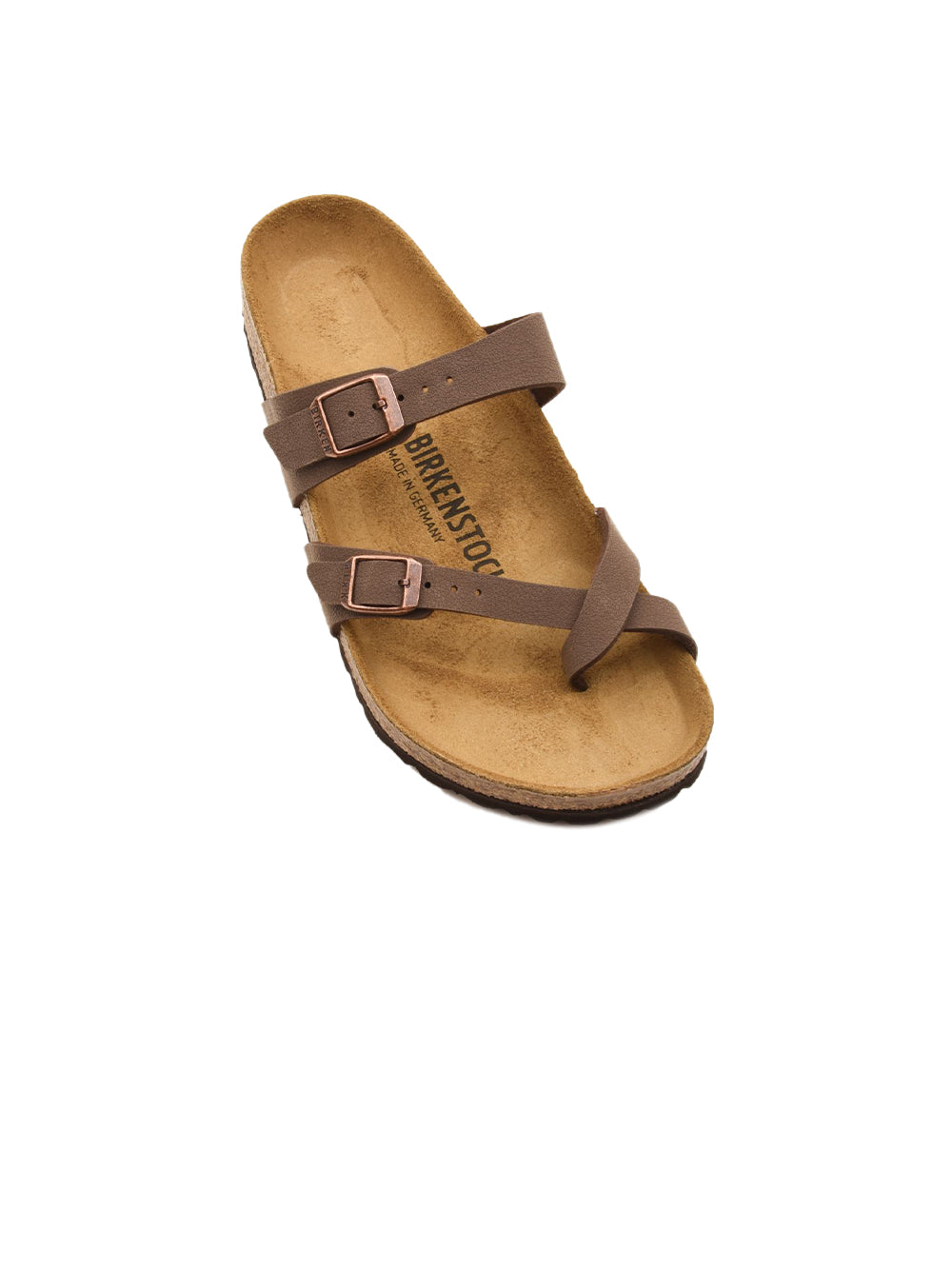 Ciabatta Mayari Birkibuc Birkenstock Unisex - Marrone. Il design presenta un infradito con una struttura a cinturino incrociato attorno all'alluce per una silhouette slanciata. La tomaia è realizzata in Birko-Flor®, un materiale sintetico resistente con un effetto Nabuk che imita la pelle naturale. Il plantare anatomico è composto da sughero e lattice, mentre il sottopiede è in morbida pelle scamosciata per un comfort ottimale. La suola è realizzata in materiali leggeri EVA.