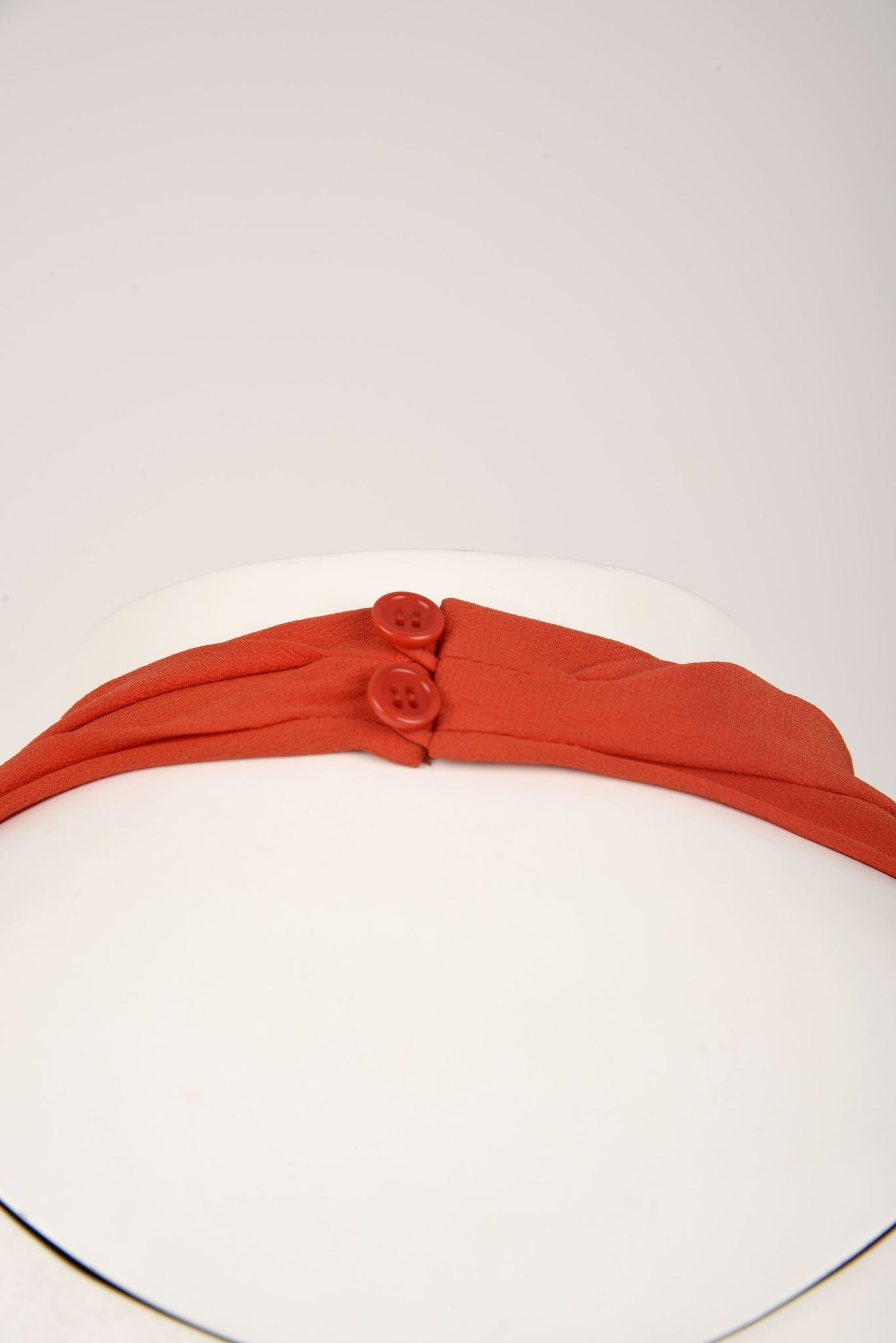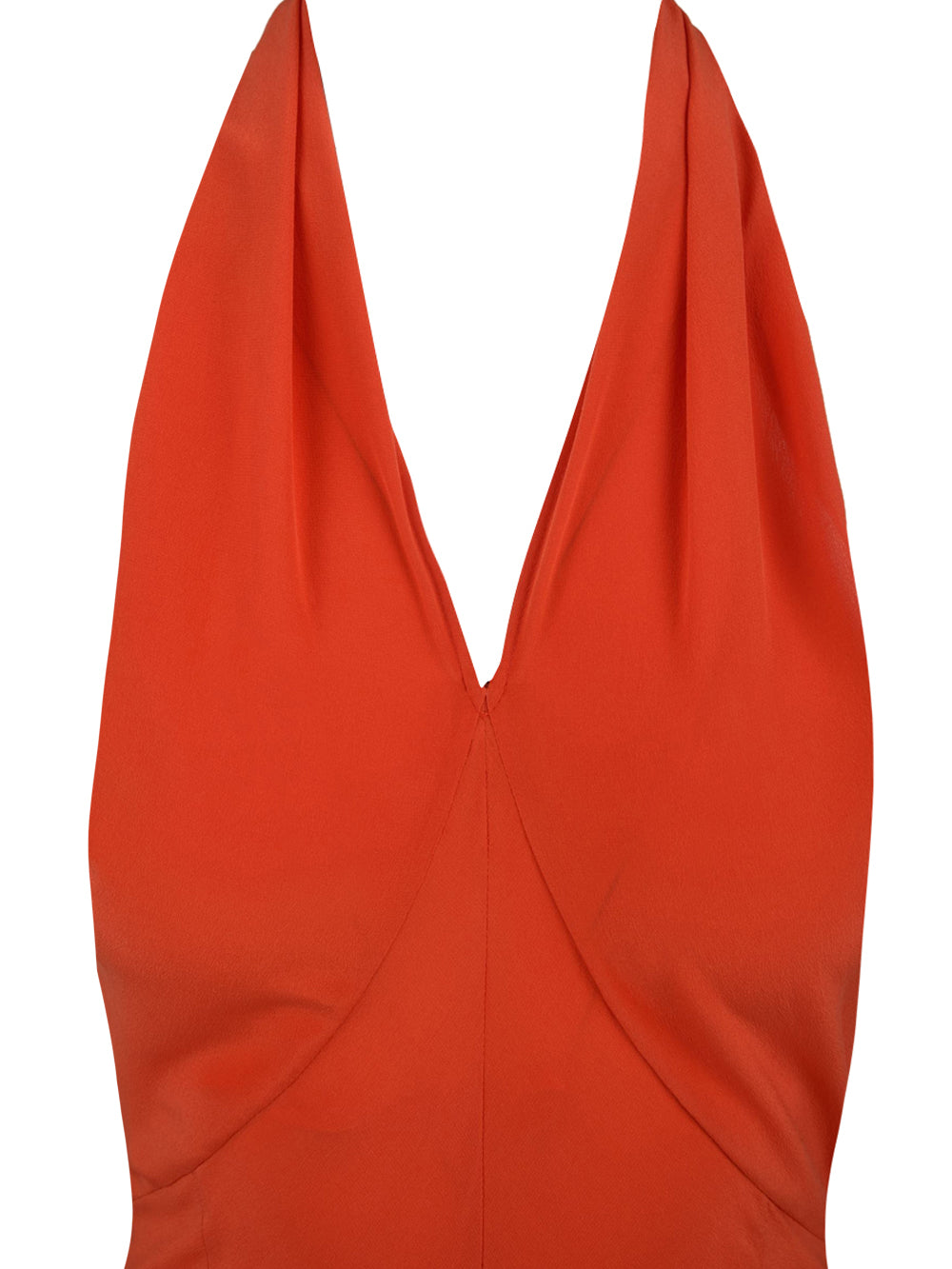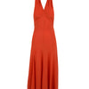 Long women's dress in coral color, with V-neck. The sleeveless line is finished with buttons behind the neck. A classic and elegant style garment, suitable for any occasion.