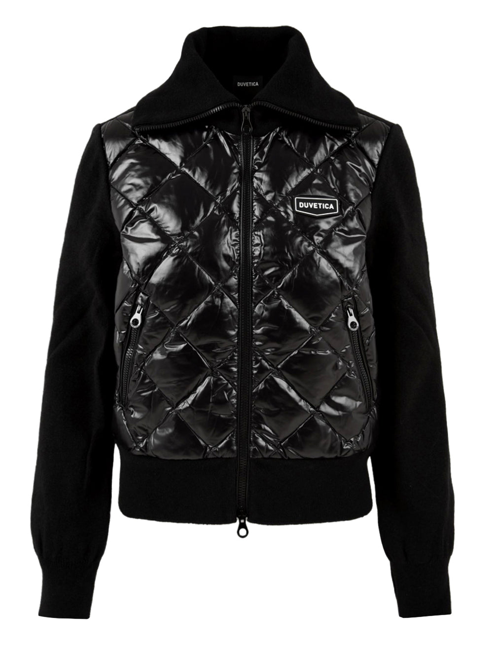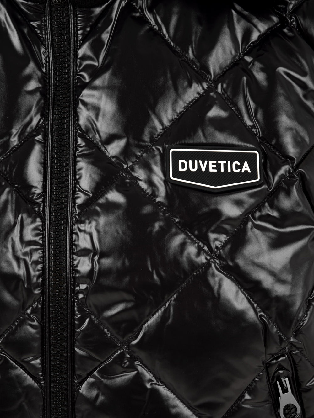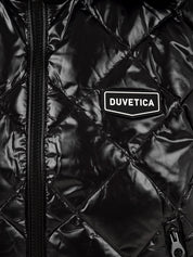 The Cefalu women's jacket by Duvetica is made of a soft fabric and down padding. This jacket has a modern diamond quilting, logo patch on the front, front zip closure, front pockets with zip closure, and a long collar that offers excellent warmth.