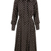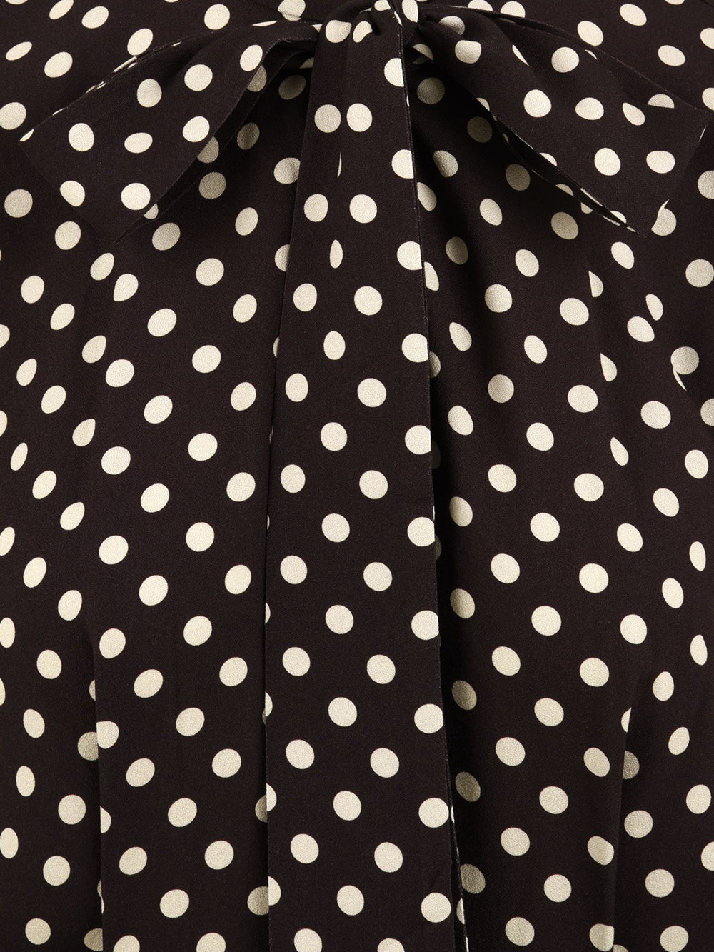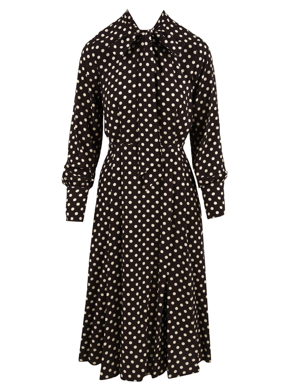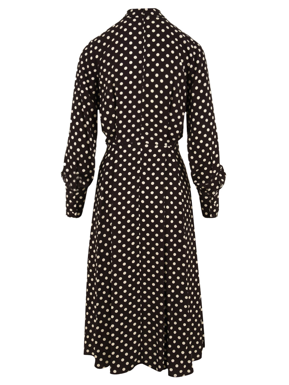 L'abito Georgia è perfetto per essere indossato in diverse occasioni, dal lavoro a un evento serale. Può essere abbinato con un paio di stivali alti in pelle per un look audace o con delle décolleté eleganti per un tocco più classico. Il motivo a pois medio moro aggiunge vivacità al nero dell'abito, enfatizzando la femminilità e l'eleganza innata di chi lo indossa.