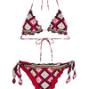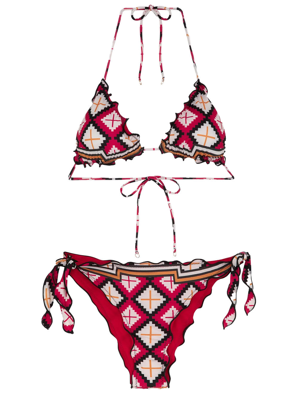 Ce bikini femme aux bords frisés de Me Fui vous fera sentir élégamment estival ! Fabriqué à partir de tissu Lycra confortable et extensible, ce bikini comporte un haut triangle avec un slip à nœud réglable pour un ajustement parfait. Les bords froncés donnent une touche de style et le vêtement est équipé d'un rembourrage interne amovible pour un maintien parfait. Le motif all-over ajoute une touche de couleur à votre été.