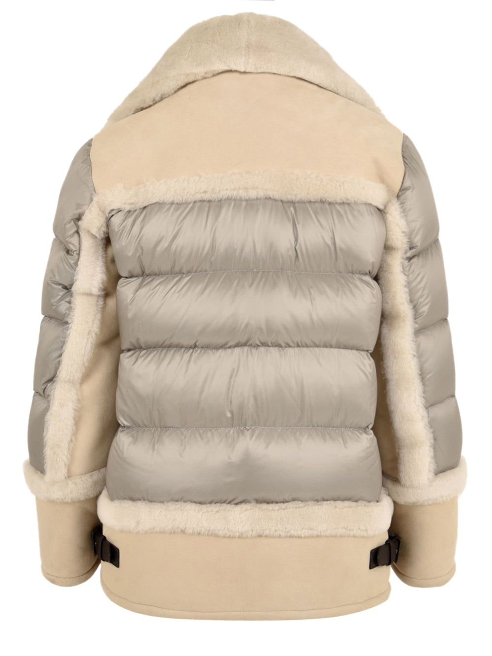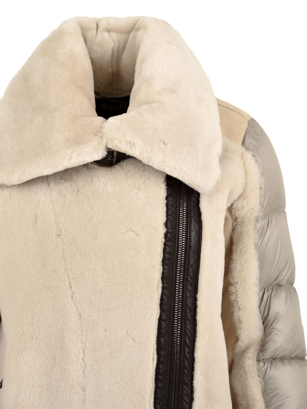 Veste Femme, modèle Escorial-Mjo, signée Moorer . Equipé d'un insert en peau de mouton sur le devant et d'inserts en duvet contrastés. Il présente une fermeture centrale à double curseur et deux poches latérales zippées. Un vêtement tendance, chaud et polyvalent, ne le manquez pas !