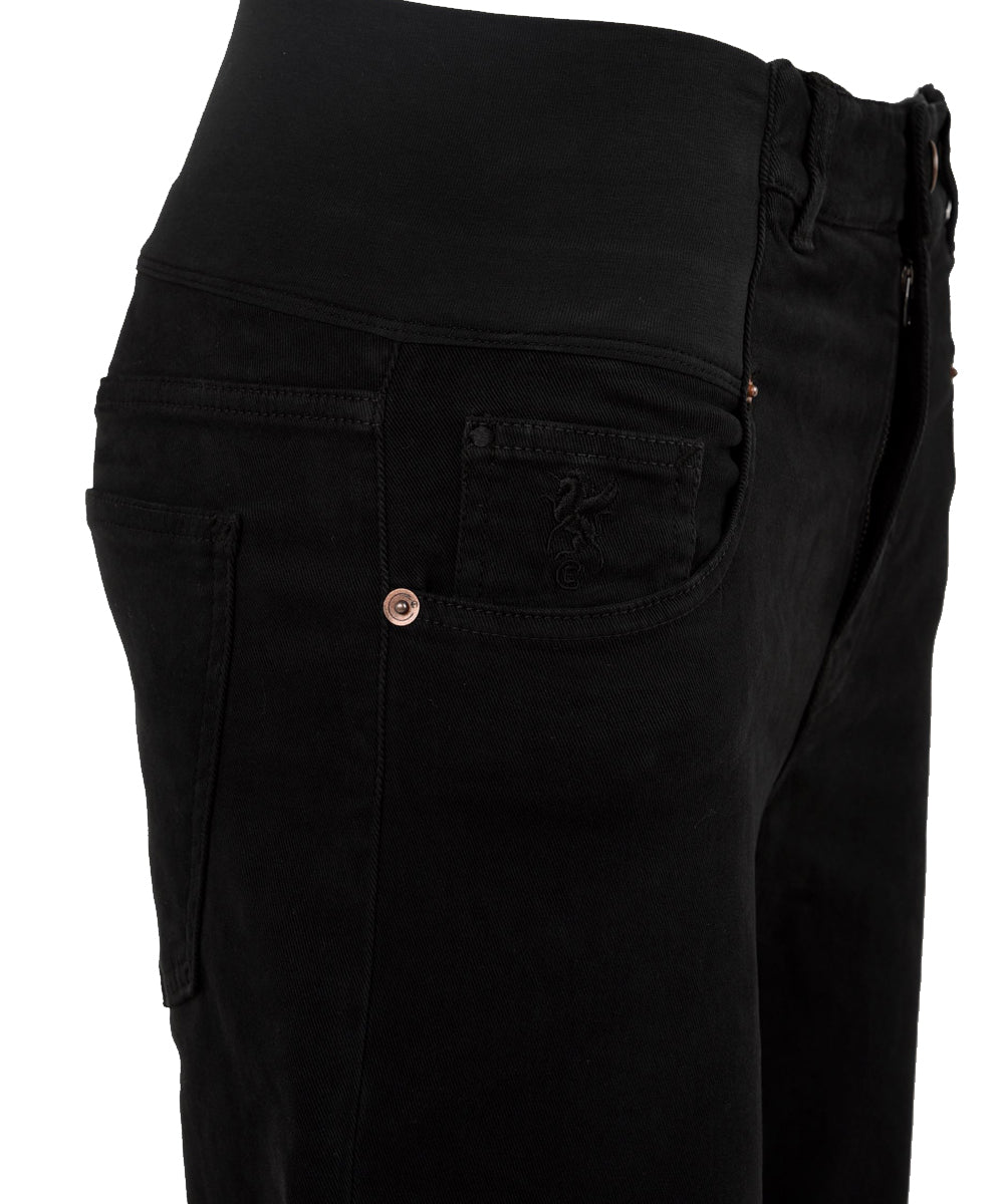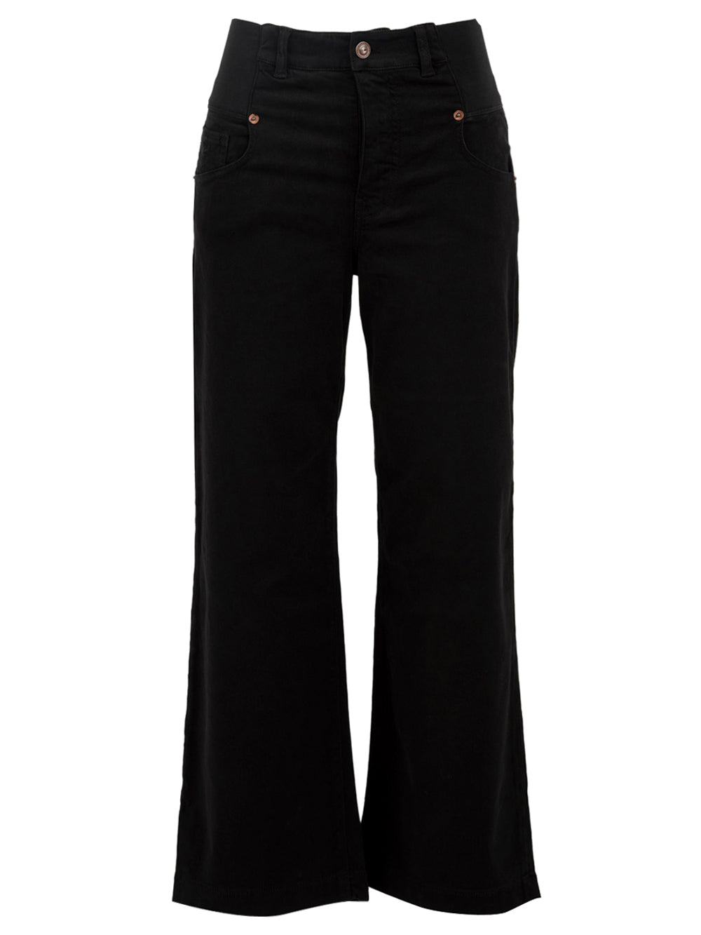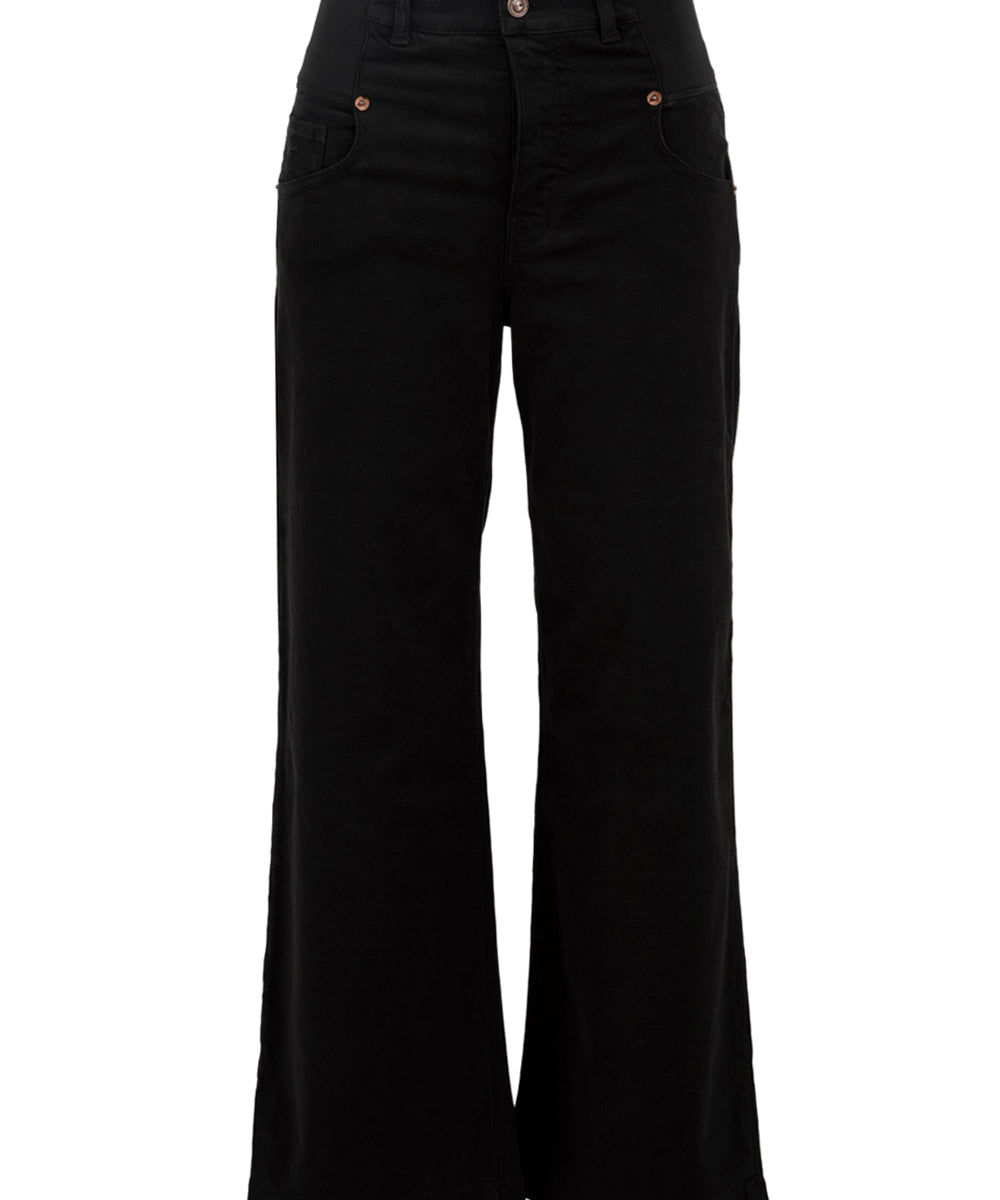 Pantalon femme noir de European Culture en coton doux. Fermeture zippée et boutonnée, bas évasé pour un look tendance. Parfait pour l'automne.