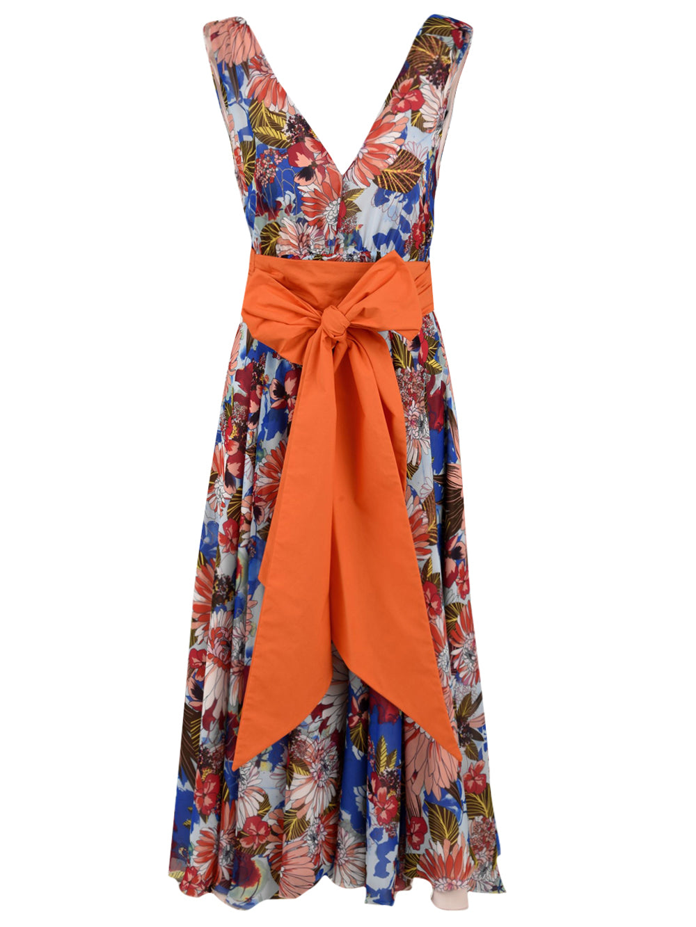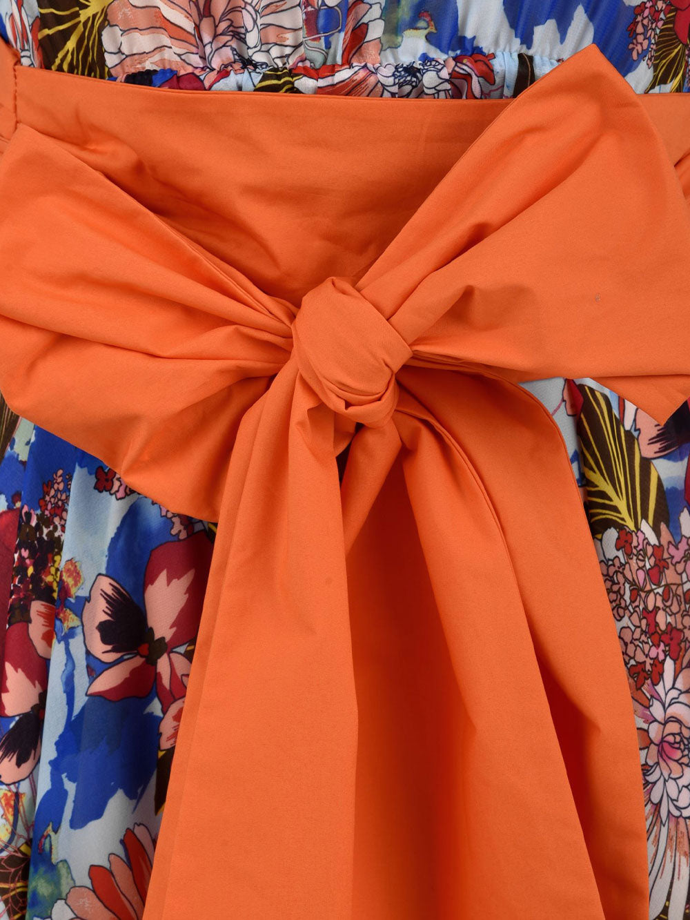 Robe pour femme de l'Atelier Legora entièrement en polyester au design moderne et dynamique avec grand décolleté en V et nœud sur le devant. Un vêtement élégant enrichi d'un motif floral en contraste frappant avec la couleur du nœud placé sur le devant.