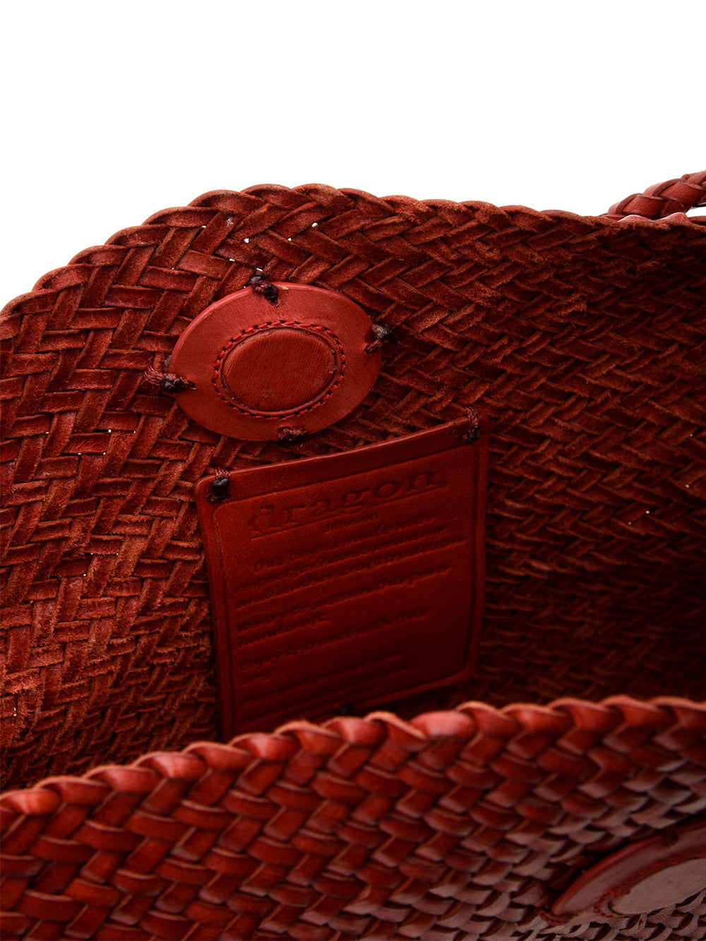 Borsa Corsina Diagonal Weave Flap Dragon Diffusion donna - rosso. La borsa presenta una costruzione in pelle intrecciata a mano con un design a trama diagonale. È dotata di una pattina superiore che offre una chiusura sicura e discreta. La struttura è compatta con una silhouette rigida. Le dimensioni 21 x 14 x 9 cm permettono un utilizzo versatile, mentre la lavorazione artigianale garantisce qualità e attenzione ai dettagli.